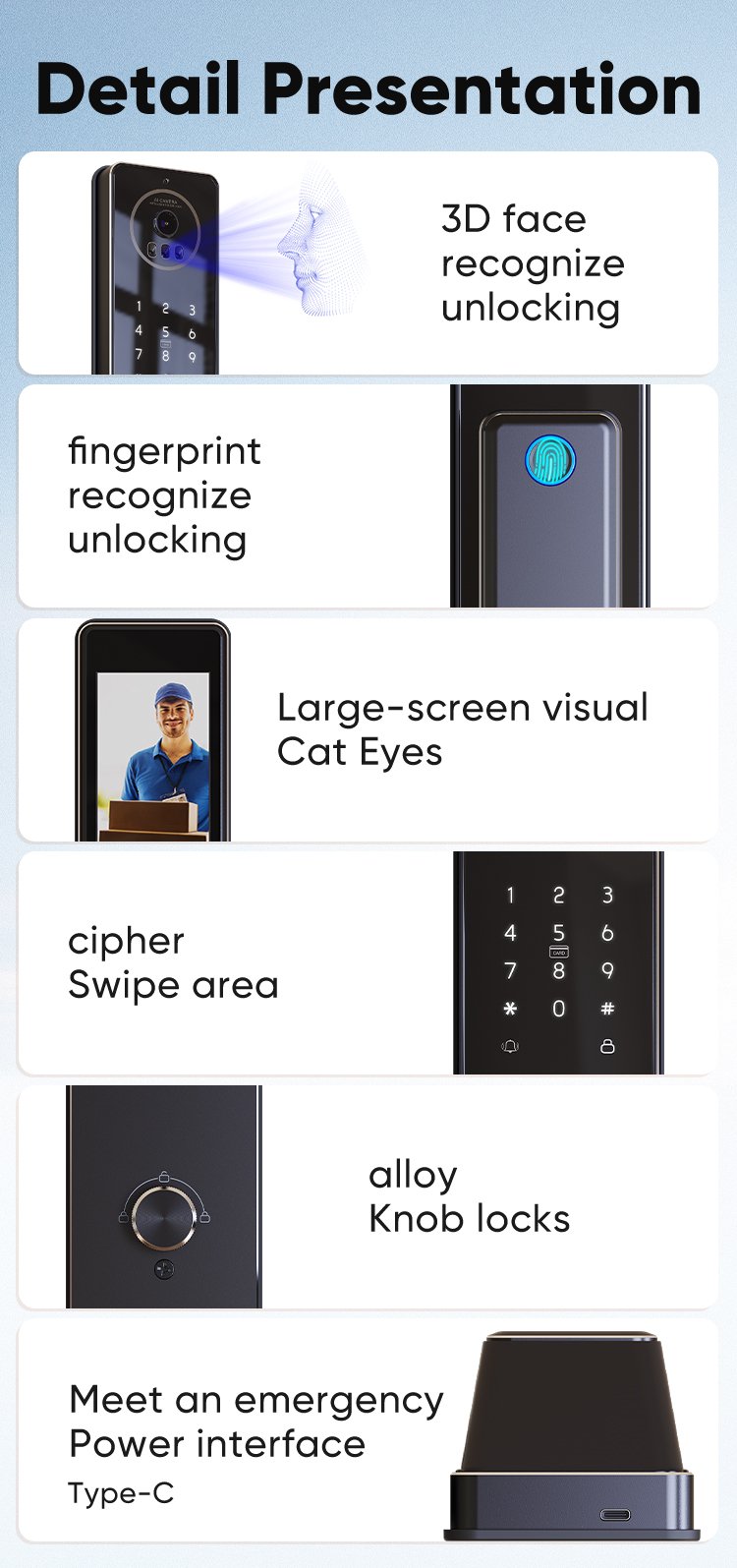 1.7 ways to unlock: Palm Veins Unlock,3D Face, APP, Fingerprint Unlock, PassCode, Card, Mechanical Key Unlock;