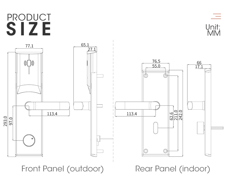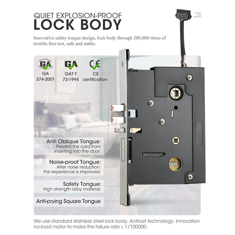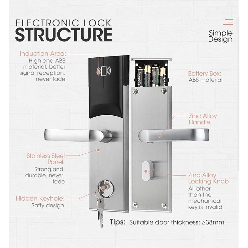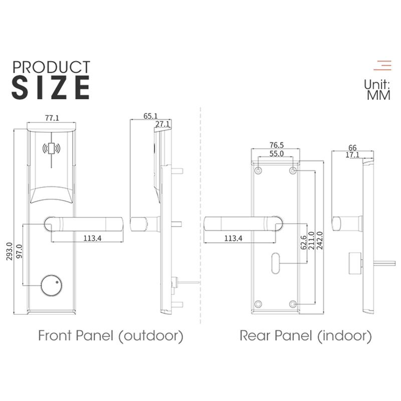 LS-8088 Hotel Smart Lock Technical Specs (EN)Core FeaturesMulti-Mode Access: RFID/MIFARE cards, mechanical keys, optional APP/Bluetooth controlEnhanced Security: Anti-tamper alarm, 5-bolt locking system (micro-switch monitored), low-battery alert & emergency powerDurable Design: Stainless steel + ABS cover, compact lock core (fits 38–60mm doors), hidden battery compartmentSmart Management19-tier access cards (Master/Guest/Emergency/Cleaning) with time/zone limitsAuto card deactivation post-checkout, 500-event log storagePMS integration for real-time updates (room sync, permissions)TechnicalPower: 4×AA (6V), low-voltage alert.Environment: -20°C–60°C, 20–90% RH.Certifications: CE/FCC/RoHSApplications: Hotels, serviced apartments, commercial buildingsSupport: 2-year warranty, 24/7 tech service