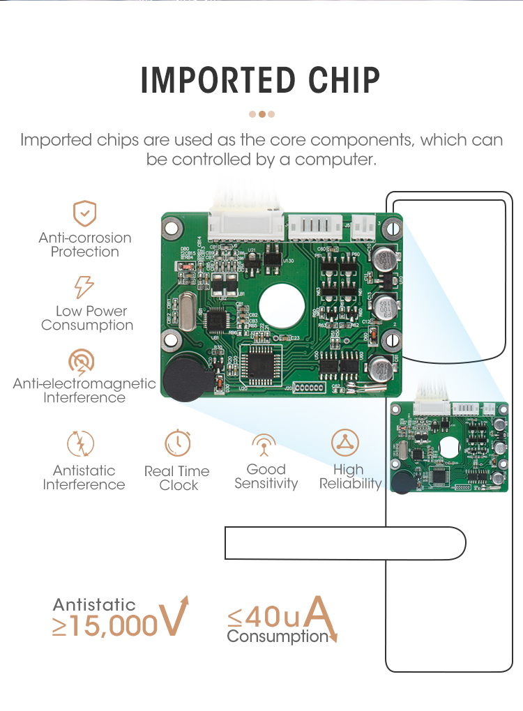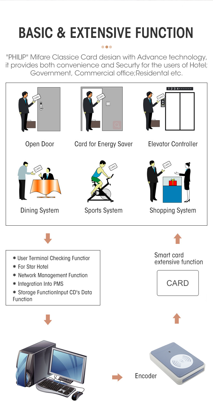 9. Management classification: support 14 types of cards including authorization card, clock card, room number setting card, master card, emergency card, floor card, building card, guest card, temporary card, house keeping card, alarm card, no-disturbing card etc