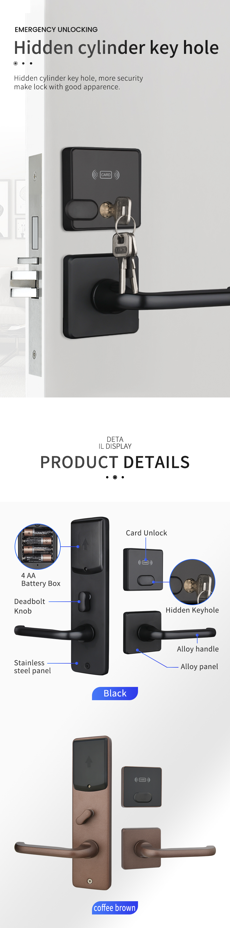 - Unlock by RFid card + backup mechanical key
