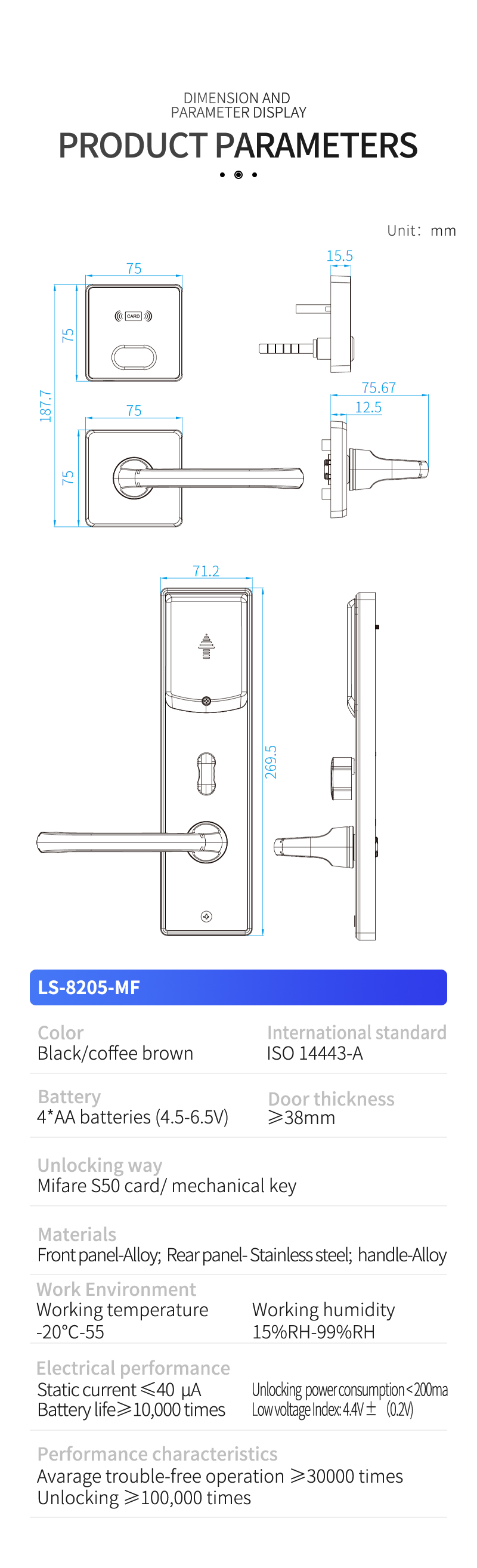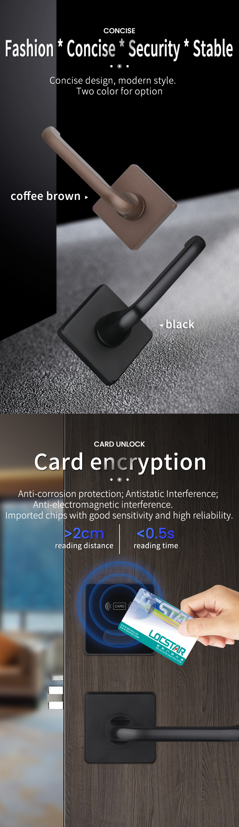 LCOSTAR hotel lock(LS-8205),can unlock by key card and mechanical key. support different management requirement, such as building card/floor card/maid zoon card management/ foreman card/front desk card and so on. also supply full set accessories to work together, encoder/energy saver/printing card/data collector.